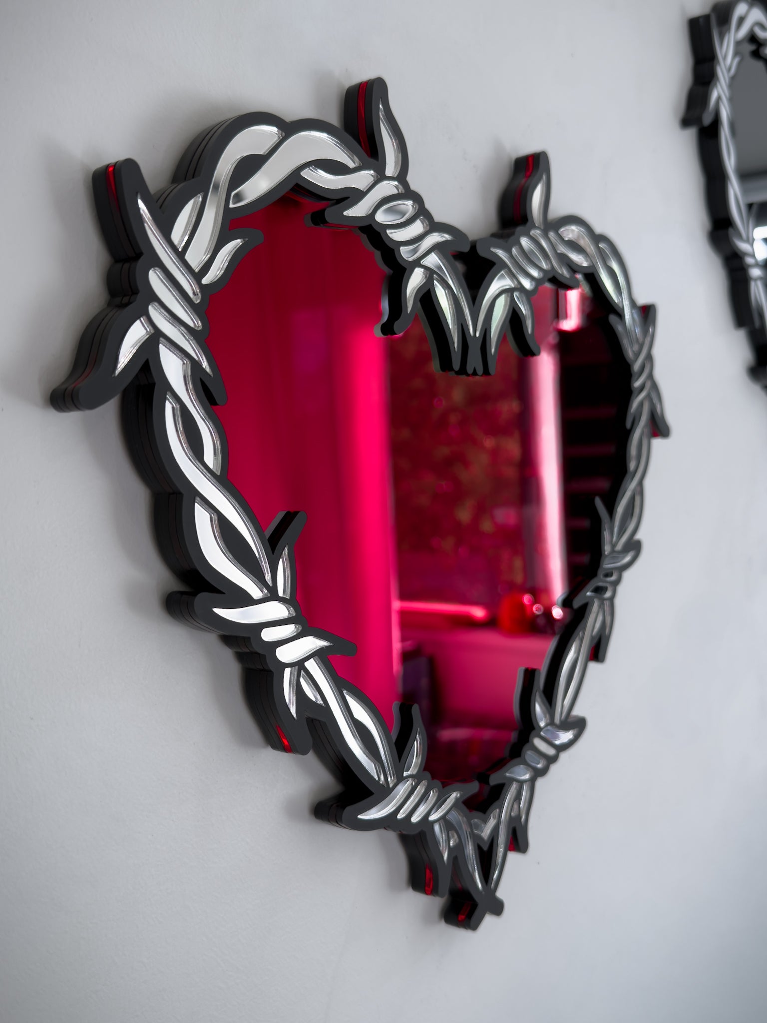 Layered acrylic with silver mirror barbed wire detailing and mirror centre.