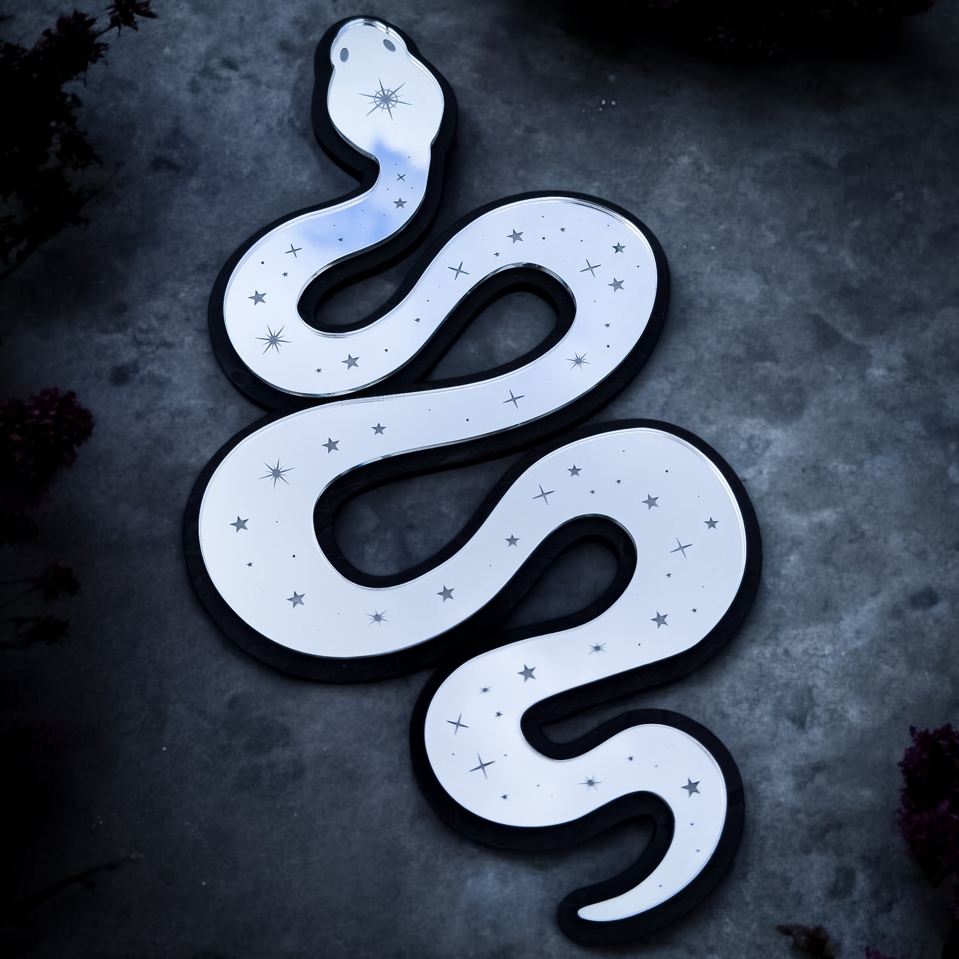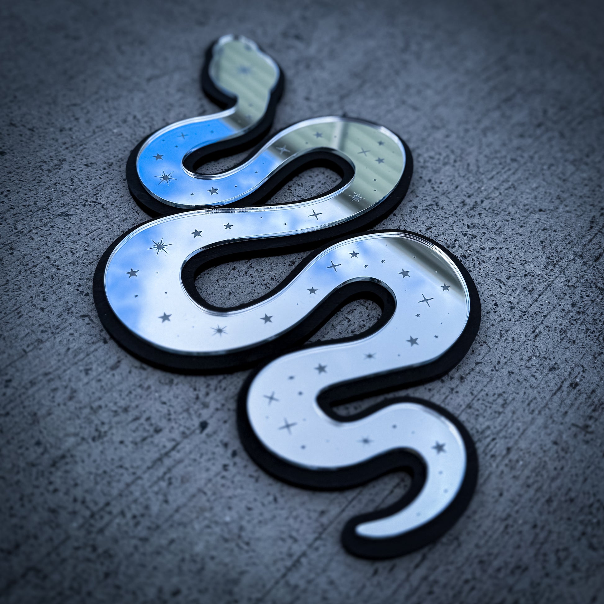 Crafted from silver mirror acrylic layered over black-stained birch, its reflective surface shimmers with engraved stars and celestial markings, shifting with the light like a living, mystical creature.