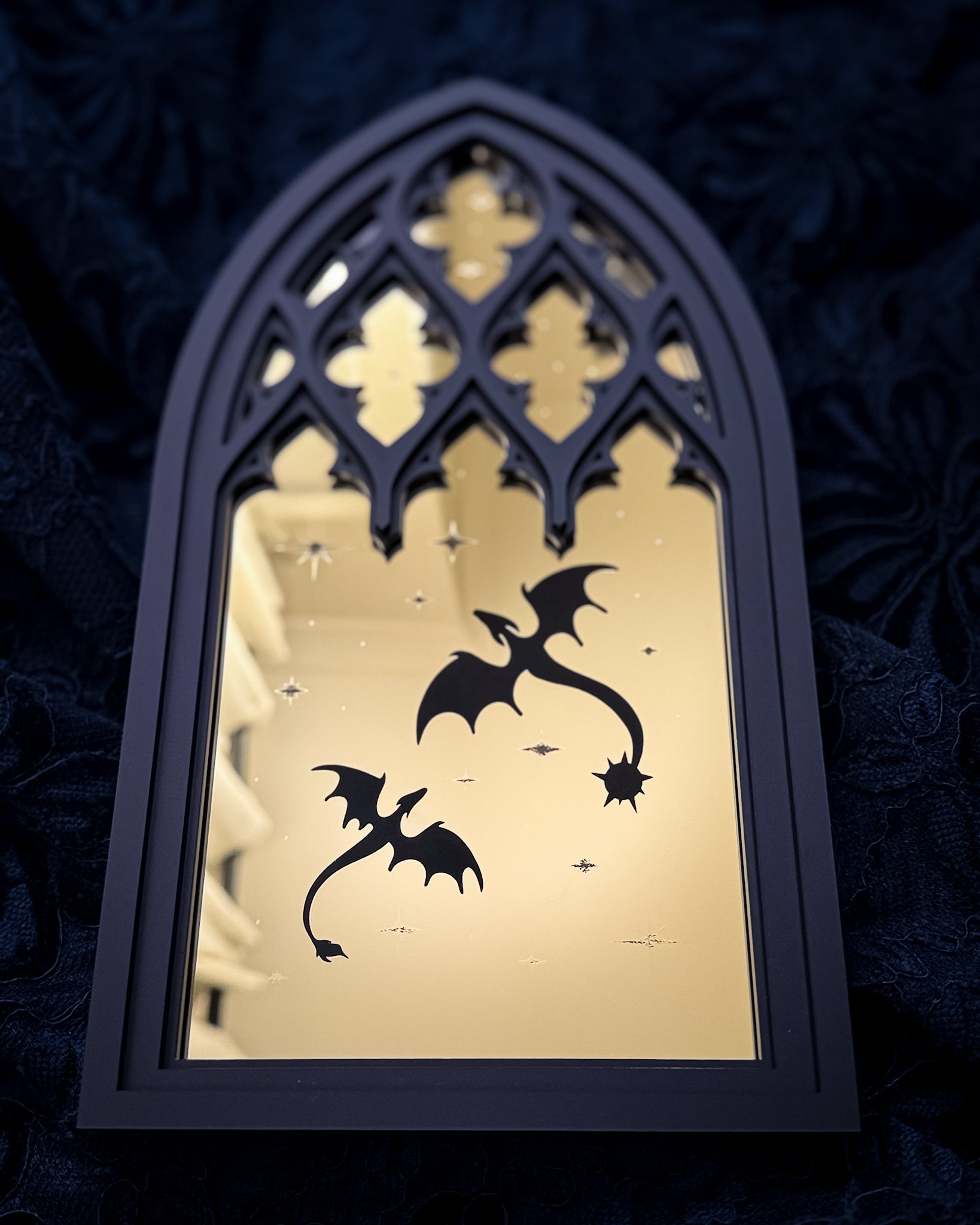 Laser-cut from matte black acrylic and backed with your choice of luminous mirror insert, it reflects both celestial shimmer and fiery drama. Perfect for walls, bookshelves, or altar spaces, this gothic fantasy window transforms your home into a realm of dragons and starlight.