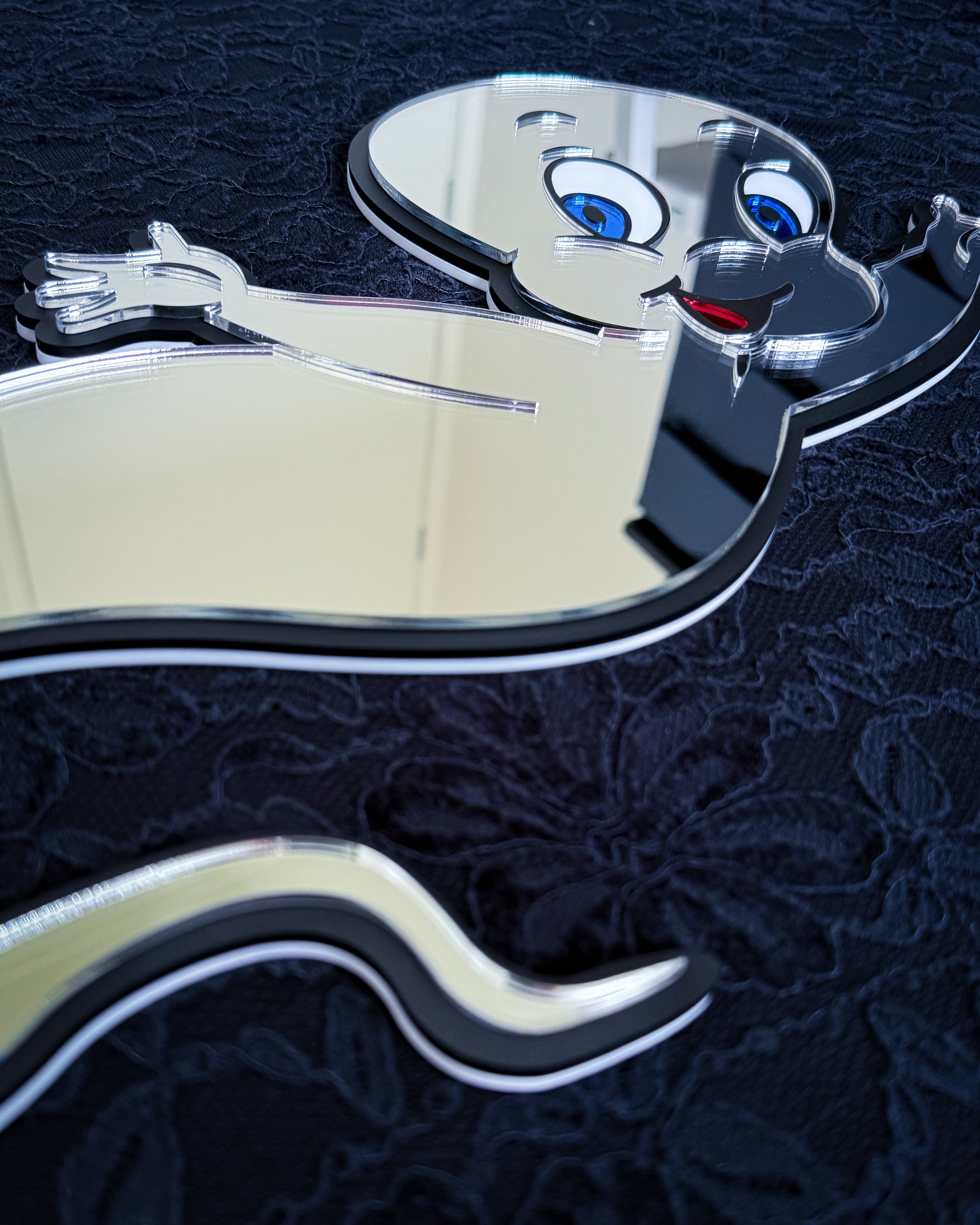 Choose a crisp white acrylic body for a bold retro look, or a silver mirror body that catches the light with an almost translucent effect. Built from three stacked layers of acrylic with a matte black border, it has real depth and a polished finish — ready to bring a touch of spectral magic to your home.