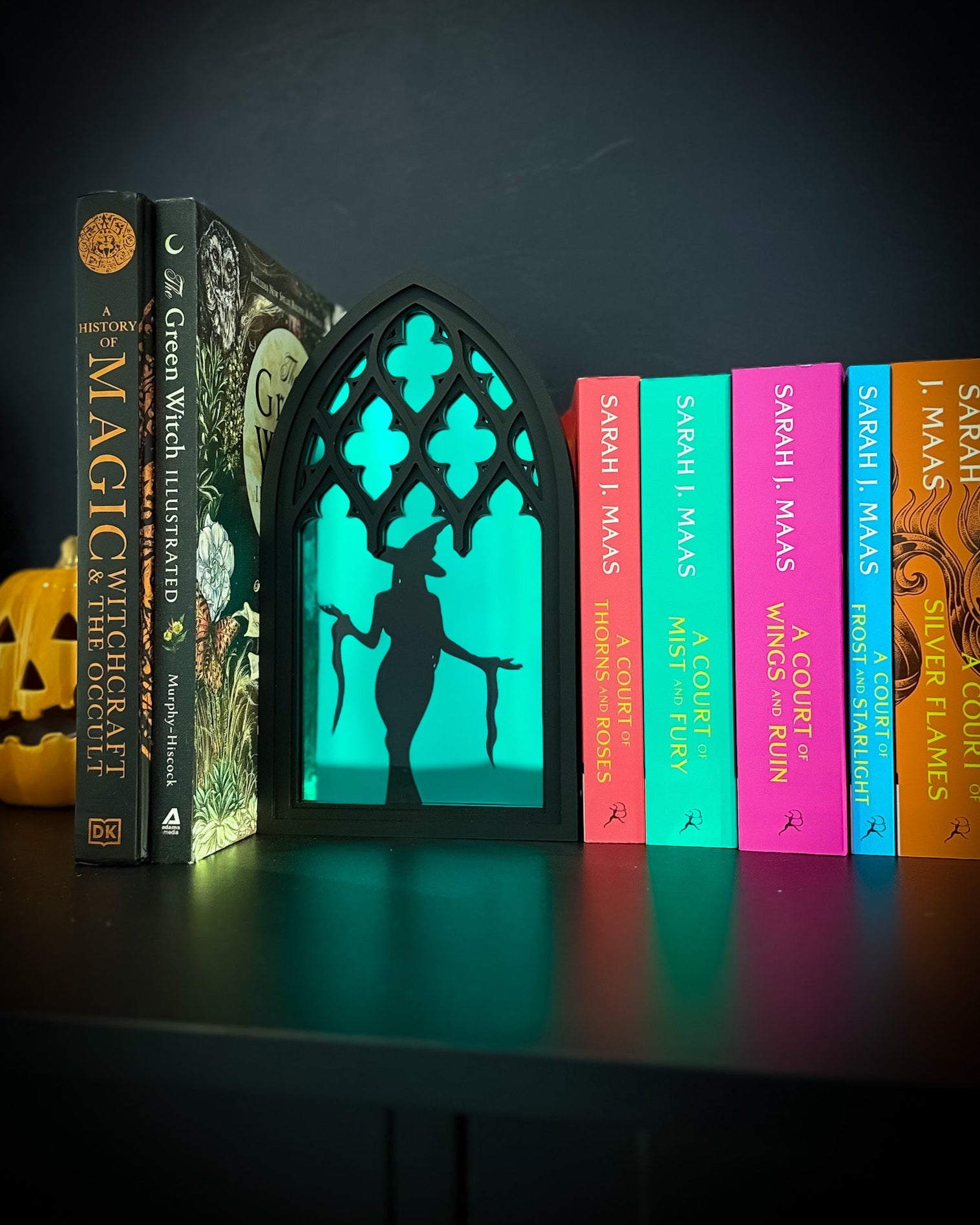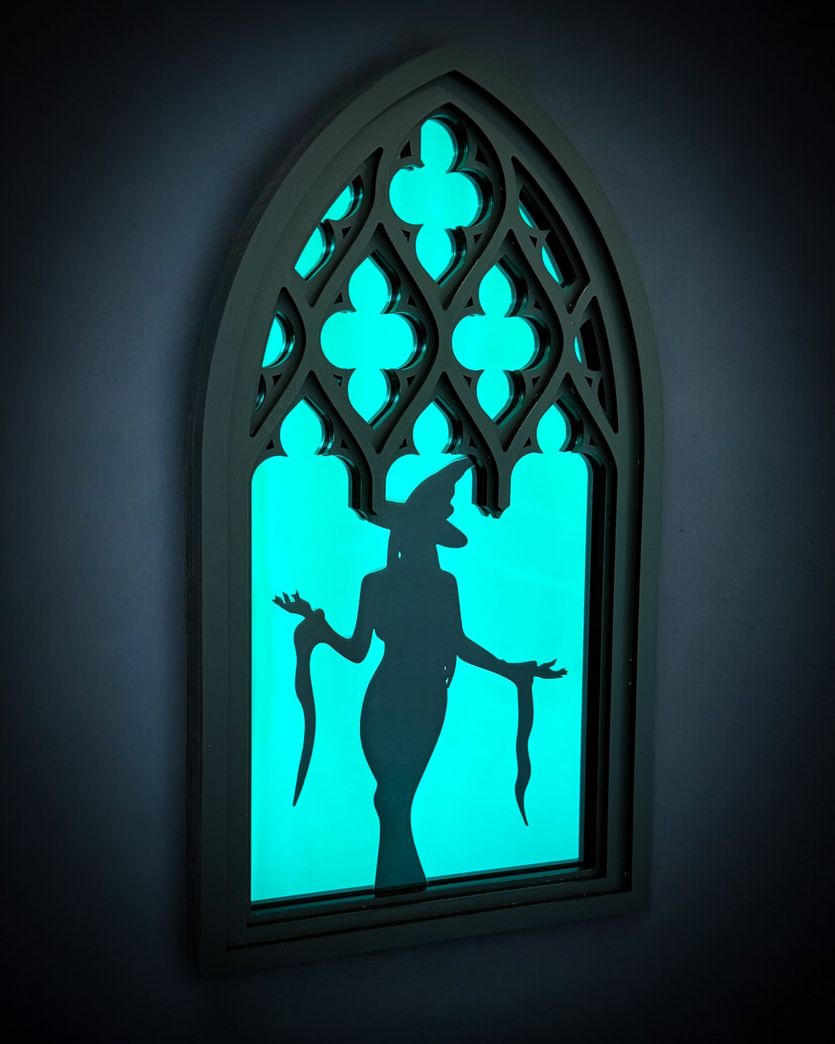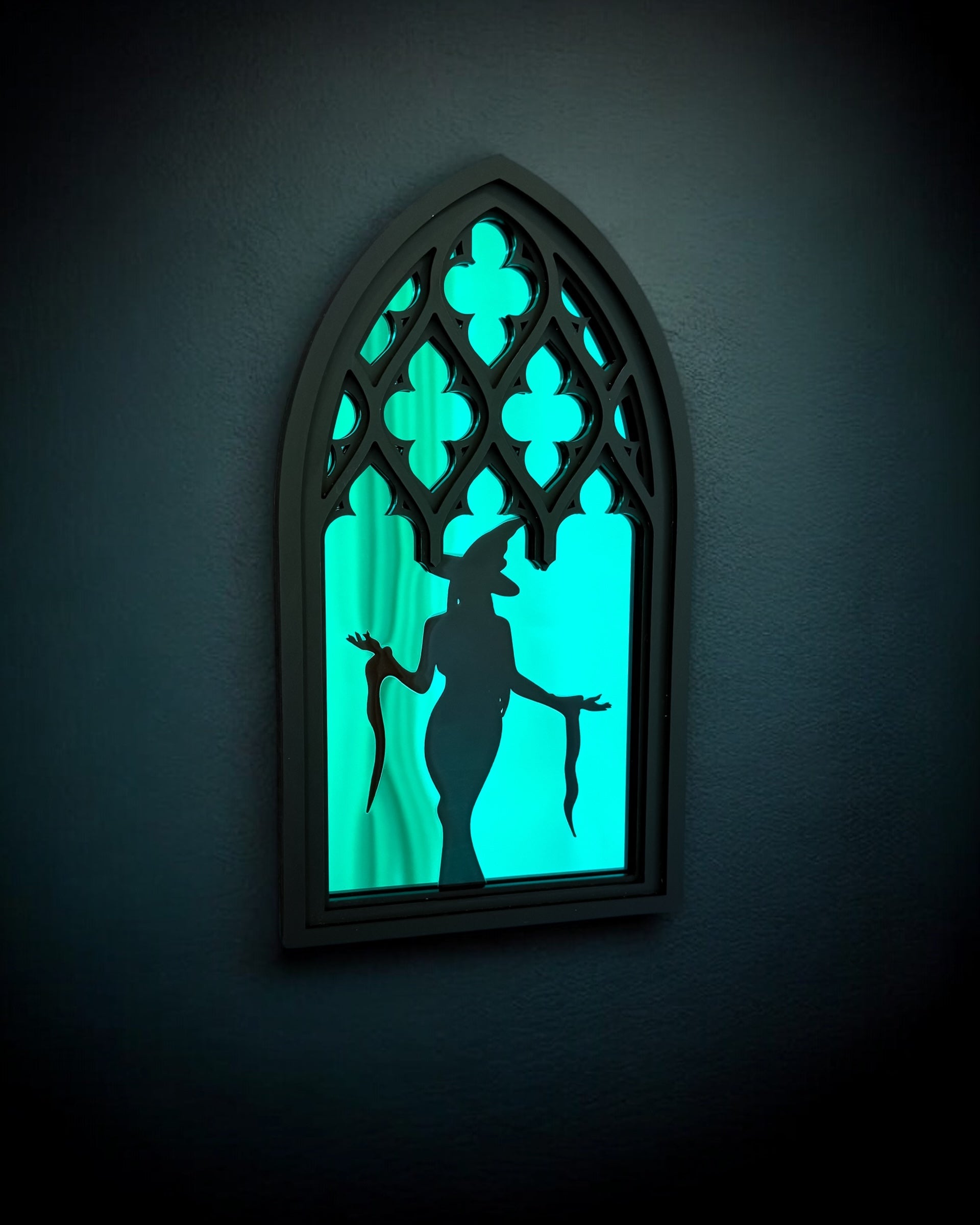 A shadowy figure lingers behind stained-glass-inspired panes — elegant, eerie, and full of mystery. The Witchlight Window blends gothic cathedral architecture with occult charm, inviting you to peer into a world where witches watch from behind the glass.