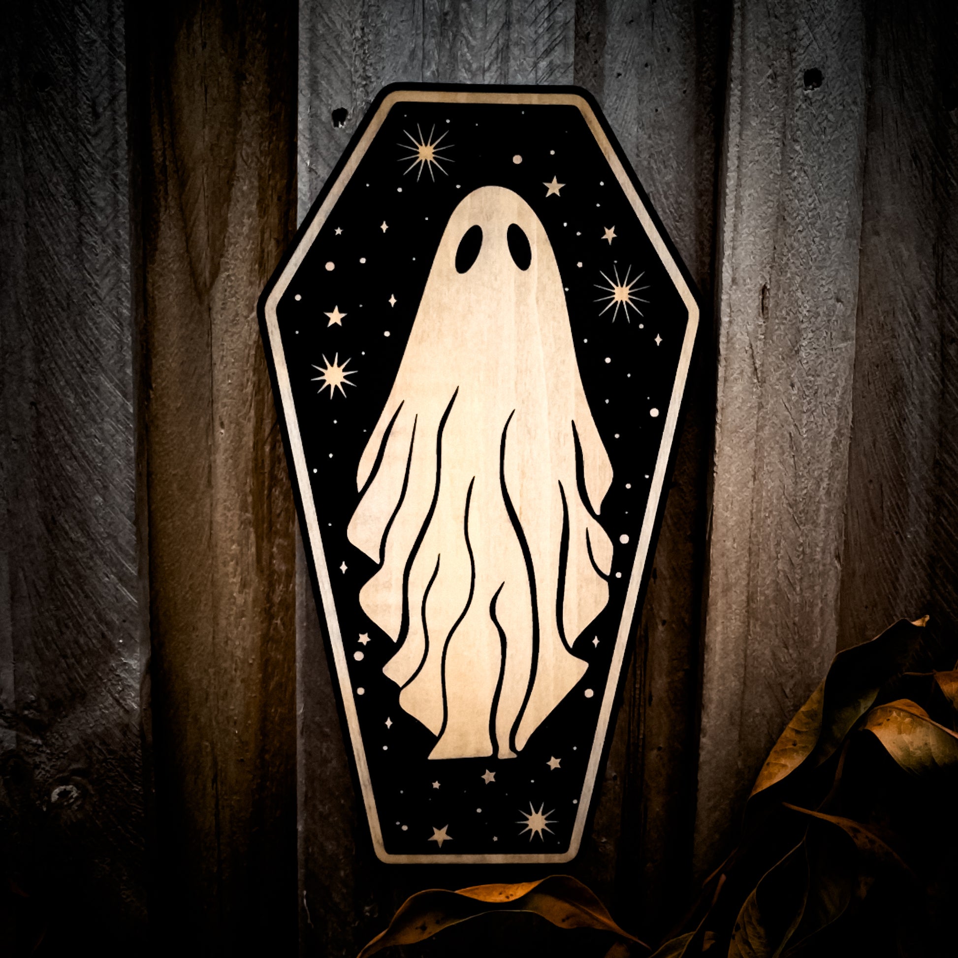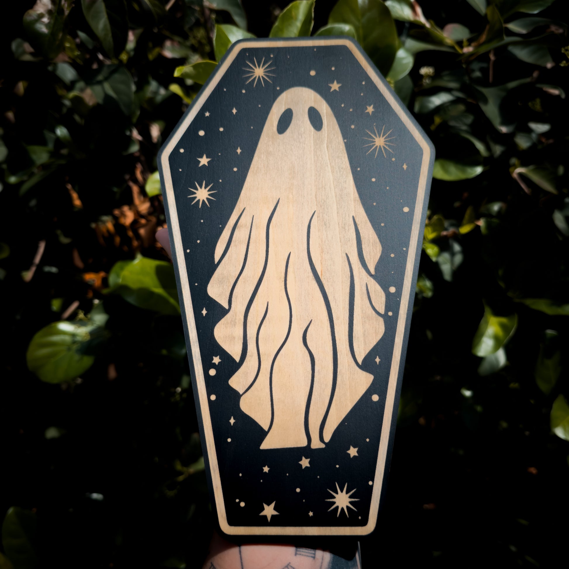 Add a whisper of the otherworldly to your walls with this Celestial Ghost Woodcut—a haunting fusion of gothic charm and cosmic elegance. Nestled within a classic coffin shape, the flowing ghost silhouette drifts through a star-scattered backdrop, blending spooky vibes with celestial wonder.
